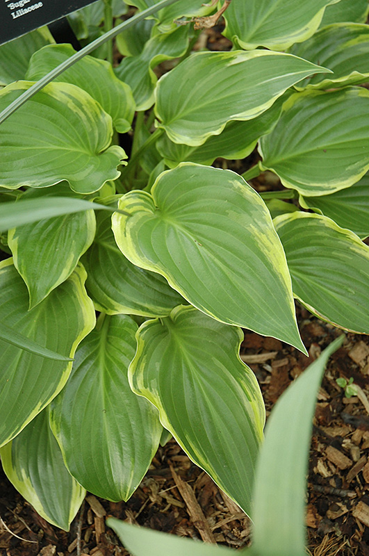 A medium sized variety great for adding color and texture to summer beds, borders and containers; medium to dark leaves are edged in creamy white; fragrant lavender flowers rise above on tall scapes during the midsummer months