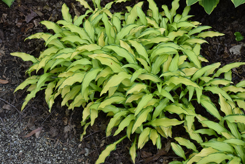 Kabitan Hosta features dainty spikes of lavender tubular flowers rising above the foliage from mid to late summer. Its attractive small textured narrow leaves remain gold in colour with distinctive green edges throughout the season.