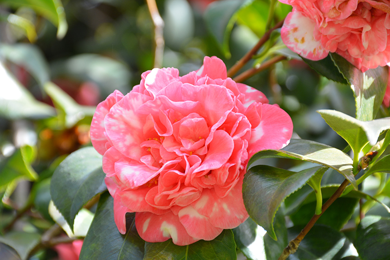 Abundant rose-pink, semi-double flowers bloom profusely; rich, glossy, evergreen foliage covers this upright, spreading shrub; provide rich, acidic, moist, well-drained soil