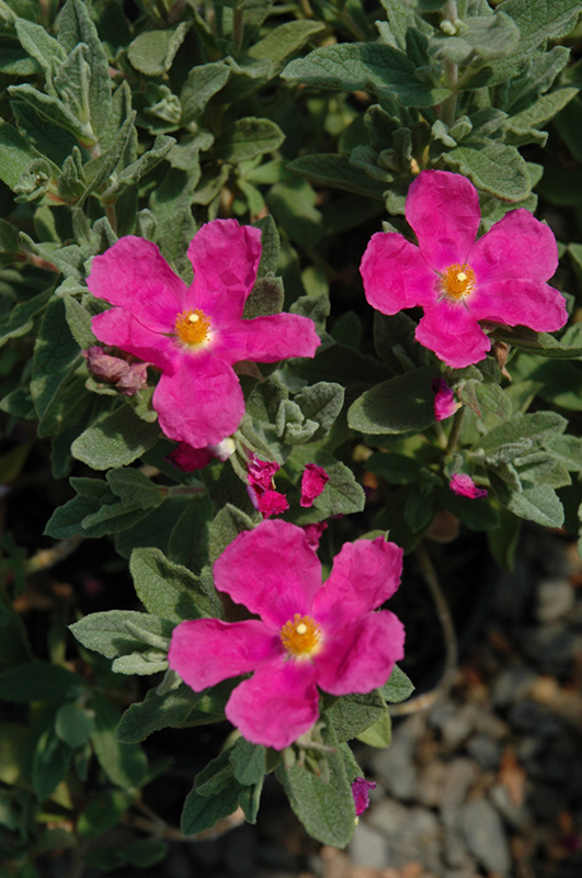 Sunset Magenta Rockrose is smothered in stunning rose cup-shaped flowers with yellow eyes at the ends of the branches from early to mid summer. It has attractive grayish green deciduous foliage. The fuzzy pointy leaves are highly ornamental but do not develop any appreciable fall colour.