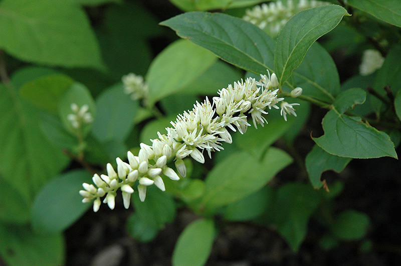 A terrific new selection that has proven to be hardier and tolerant to dry periods; exhibits dense racemes of white flowers in early summer and a spectacular scarlet display of foliage in the fall; an excellent border shrub