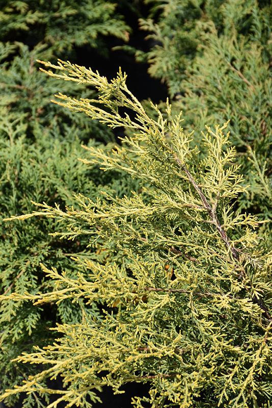 Named for its tendency to develop beautiful yellow green or gold highlights and tips in winter; it requires full sun to do this; it is prostrate and forms an extremely tidy circle of limbs that can almost appear as fern fronds