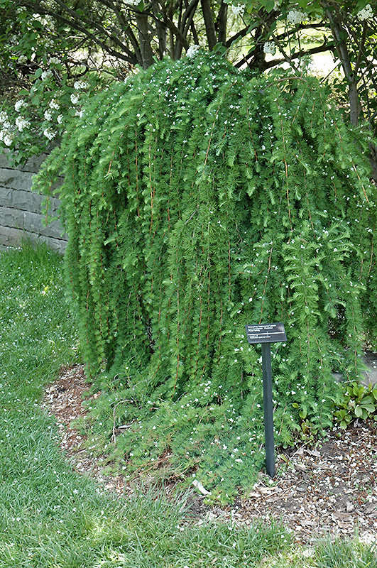 Weeping Japanese Larch will grow to be about 8 feet tall at maturity, with a spread of 4 feet. It tends to fill out right to the ground and therefore doesn't necessarily require facer plants in front, and is suitable for planting under power lines. It grows at a medium rate, and under ideal conditions can be expected to live for 70 years or more.