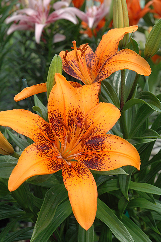 A stunning variety of lily featuring large mango orange blooms with dark plum colored center and plum spots radiating out from there; an intense contrasting splash of color when massed in the garden or border areas