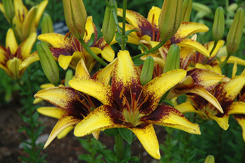 A large and showy garden lily with wide and narrow, funnel shaped, six petaled flowers on long straight stems; blooms are a spectacular yellow with burgundy centers, accented with freckles; these long lived perennials are a garden must