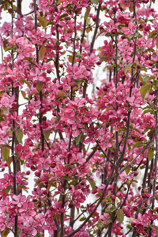 Velvet Pillar Flowering Crab features showy clusters of fragrant pink flowers along the branches in mid spring, which emerge from distinctive red flower buds before the leaves. It has attractive deep purple deciduous foliage. The pointy leaves are highly ornamental and turn an outstanding burgundy in the fall. The fruits are showy crimson pomes carried in abundance from early to late fall.