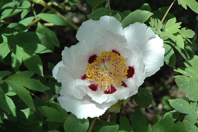 An extraordinary woody peony for the garden, producing bold white flowers with burgundy flares and prominent yellow stamens, great as an accent in the garden or massed in borders; unlike perennial peonies, remember not to prune this variety