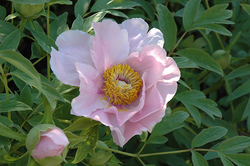 A lovley peony for the garden, with delicate flowers in a shell pink with violet tones at the eye and prominent yellow stamens, great as an accent in the garden or massed in borders; unlike perennial peonies, remember not to prune this variety