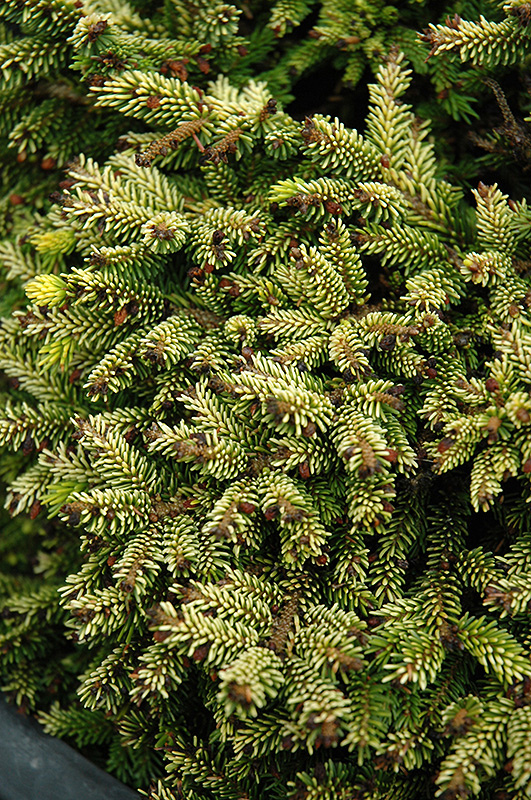 Tom Thumb Oriental Spruce is a dwarf conifer which is primarily valued in the landscape or garden for its characteristic tiered habit of growth. It has attractive gold evergreen foliage which emerges yellow in spring. The needles are highly ornamental and remain gold throughout the winter.