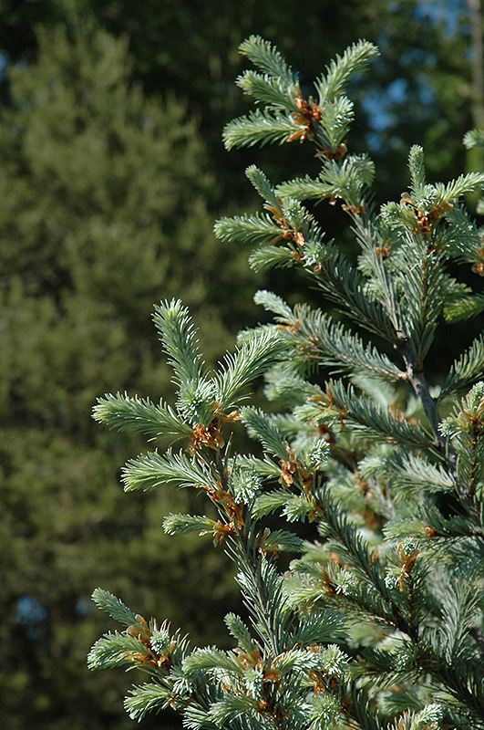 An imposing evergreen conifer with bluish-green needles with a powder blue stripe, ideal for adding a prominent vertical accent to the home landscape; requires moist soil and humid growing conditions, best with some shelter against drying winds