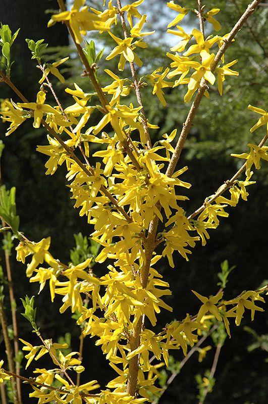 Meadowlark Forsythia is smothered in stunning gold bell-shaped flowers along the branches in early spring before the leaves. The flowers are excellent for cutting. It has forest green deciduous foliage. The pointy leaves do not develop any appreciable fall colour.