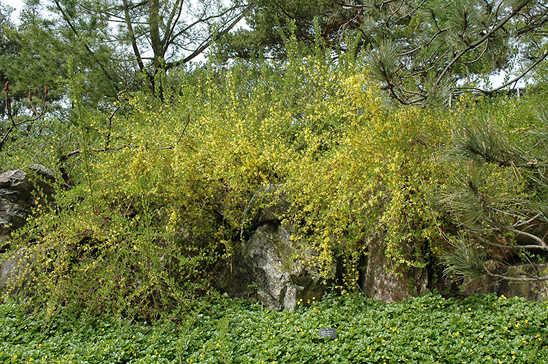 A popular low growing groundcover shrub, an unusual application for a Forsythia, yellow flowers are not as prolific as on other varieties but still ornamental; spreads vigorously, makes an excellent quick groundcover