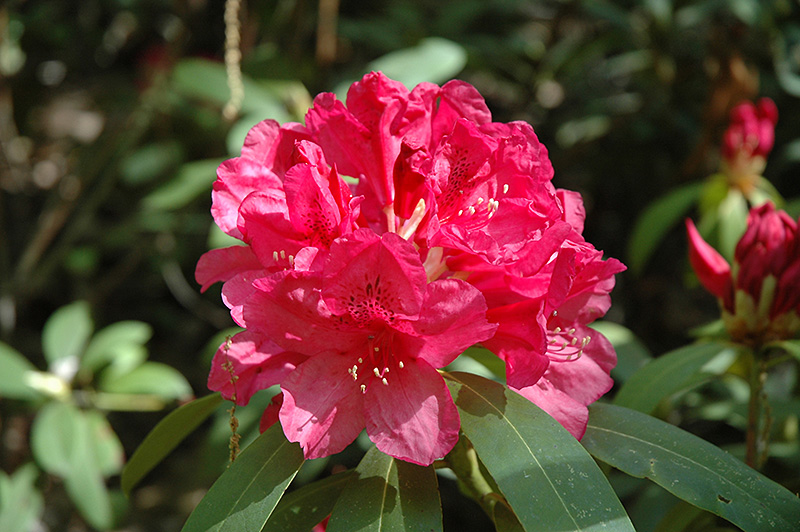 Romeo Rhododendron is covered in stunning clusters of lightly-scented pink trumpet-shaped flowers with shell pink overtones and a dark red blotch at the ends of the branches in mid spring, which emerge from distinctive red flower buds. It has olive green evergreen foliage. The glossy narrow leaves remain olive green throughout the winter.
