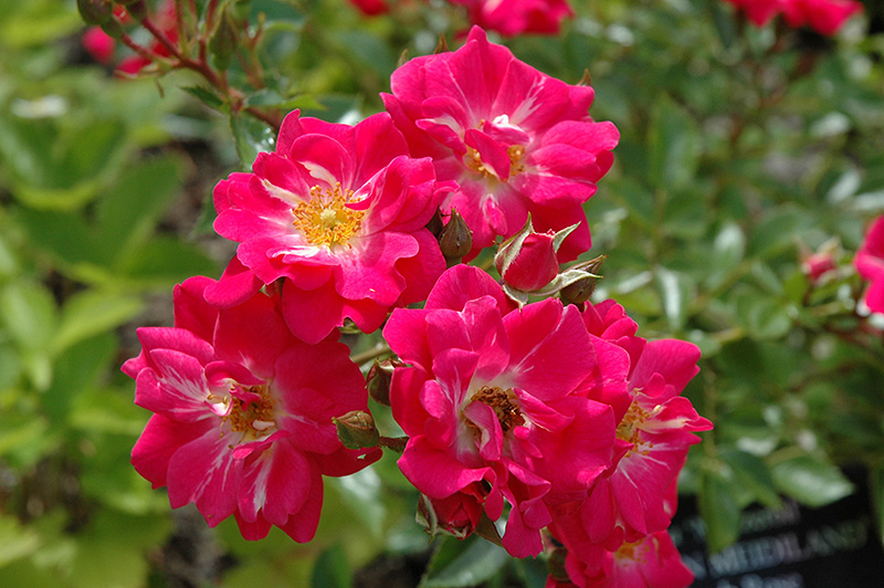 Crimson Meidiland® Rose is bathed in stunning lightly-scented semi-double crimson flowers with gold eyes and white centers at the ends of the branches from late spring to late summer. The flowers are excellent for cutting. It has dark green deciduous foliage. The glossy oval compound leaves turn burgundy in fall.