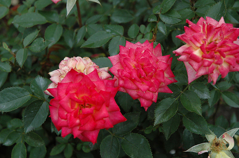 A unique miniature variety with glossy green leaves and blossoms that are shades of red,lavender and gold fading to cream; a dramatic color display that is excellent for smaller garden areas, groundcover and planters