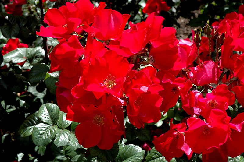 A vigorous variety producing clusters of single crimson blooms with frilly edges that free flower from summer to fall; dark green leather foliage creates contrast for the bright blooms and make this selection perfect as a dense hedge rose