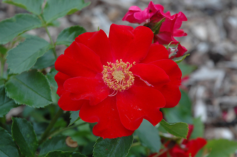Rosy Wings Rose features showy lightly-scented double scarlet flowers with gold eyes along the branches from late spring to mid fall. The flowers are excellent for cutting. It has dark green deciduous foliage. The glossy oval compound leaves do not develop any appreciable fall colour.