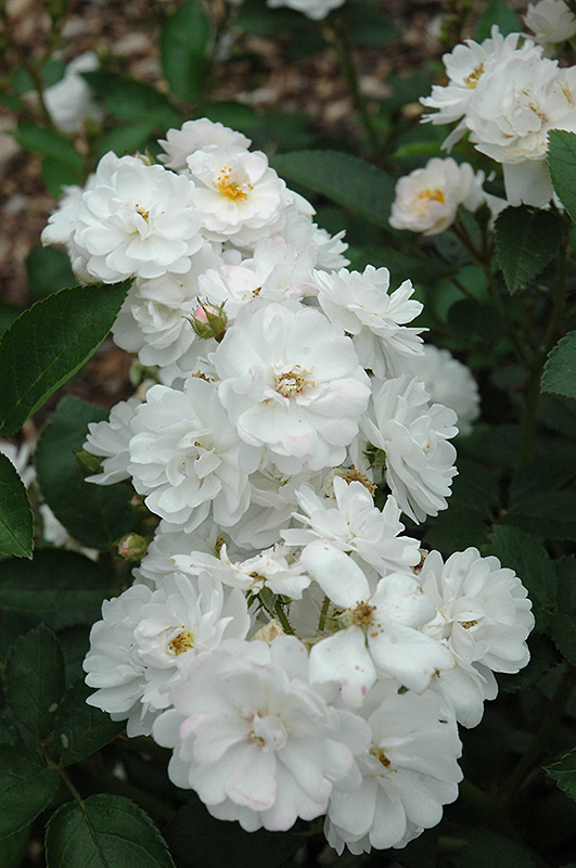 Tumbling Waters Rose features showy semi-double white flowers with gold centers at the ends of the branches from early summer to mid fall. The flowers are excellent for cutting. It has dark green deciduous foliage. The glossy oval compound leaves do not develop any appreciable fall colour.