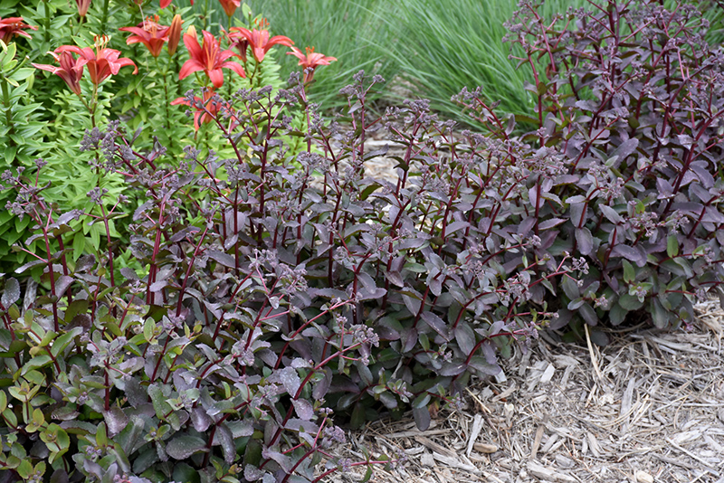 A gorgeous new stonecrop with small separated clusters of deep pink flowers over rich chocolate foliage; plants have a rounded branching habit and are very early blooming