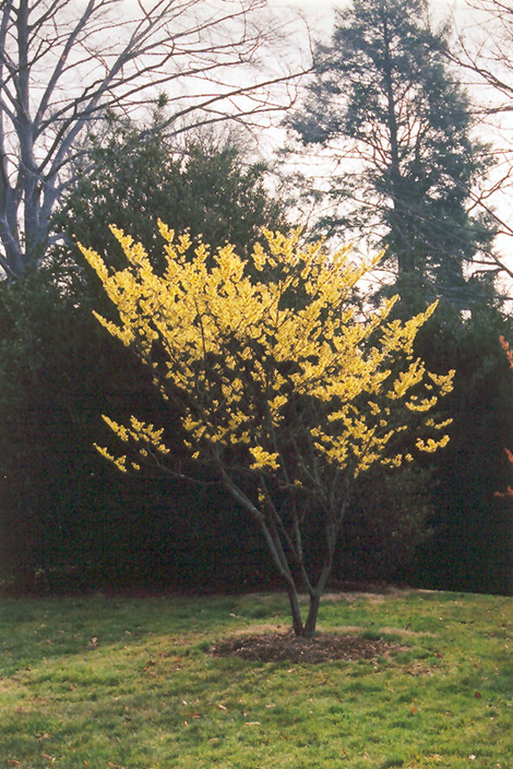 This medium sized spreading shrub brings much needed color and fragrance to the winter garden when most other plants are still dormant with its spicy-sweet golden flowers with reddish centers which appear along the bare branches in mid winter