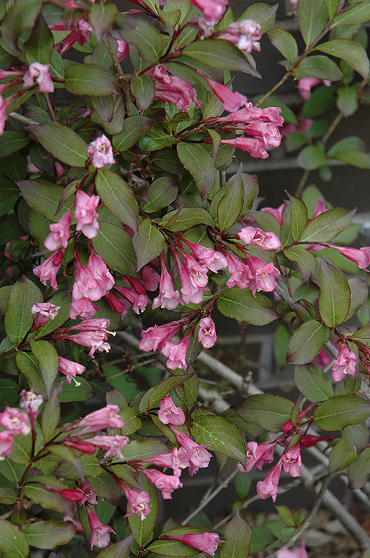 Here's one of the loveliest weigelas you've ever seen; forms a low mounded shrub with rich burgundy-purple foliage all season long, deep pink trumpet-shaped flowers attract hummingbirds in spring; very showy, ideal for the mixed garden border