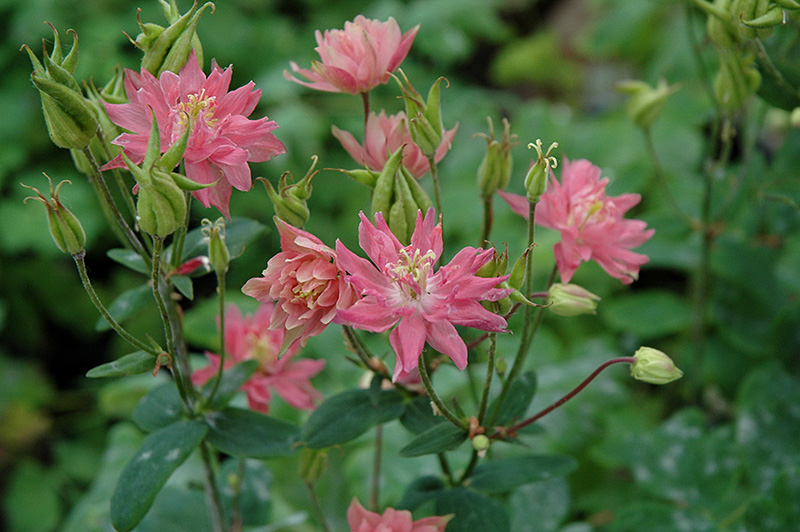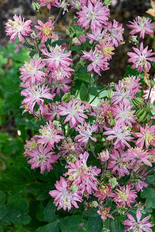 A unique variation of Colombine, featuring fluffy double flowers that resemble a small Clematis bloom, held up facing on stems, well above the lacy green foliage mound; flowers will range from dusty rose to salmon; seedlings may not resemble mother plant