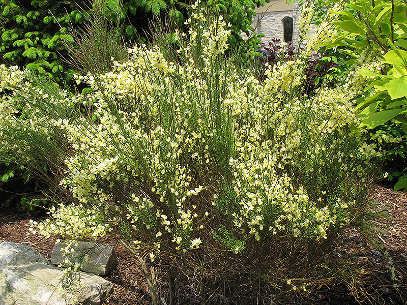 Allgold Broom is clothed in stunning lightly-scented yellow pea-like flowers with white overtones along the branches from mid to late spring. It has grayish green deciduous foliage. The small compound leaves do not develop any appreciable fall colour. The smooth bark and lime green branches add an interesting dimension to the landscape.