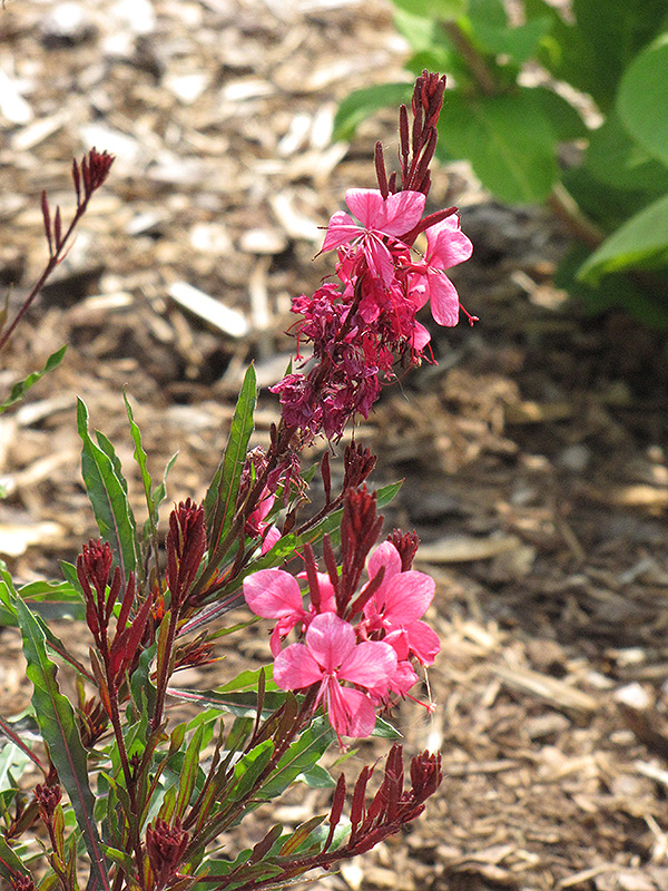 Passionate Pink Gaura will grow to be about 18 inches tall at maturity extending to 30 inches tall with the flowers, with a spread of 18 inches. When grown in masses or used as a bedding plant, individual plants should be spaced approximately 15 inches apart. Its foliage tends to remain dense right to the ground, not requiring facer plants in front. Although it's not a true annual, this fast-growing plant can be expected to behave as an annual in our climate if left outdoors over the winter, usually needing replacement the following year. As such, gardeners should take into consideration that it will perform differently than it would in its native habitat.
