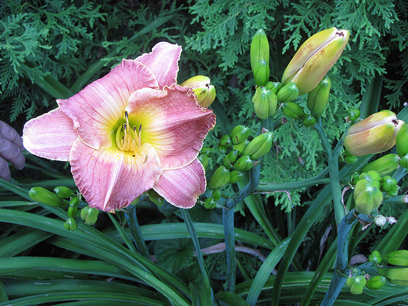 Days of Wine Daylily will grow to be about 24 inches tall at maturity extending to 32 inches tall with the flowers, with a spread of 24 inches. When grown in masses or used as a bedding plant, individual plants should be spaced approximately 18 inches apart. It grows at a medium rate, and under ideal conditions can be expected to live for approximately 10 years. As an herbaceous perennial, this plant will usually die back to the crown each winter, and will regrow from the base each spring. Be careful not to disturb the crown in late winter when it may not be readily seen!