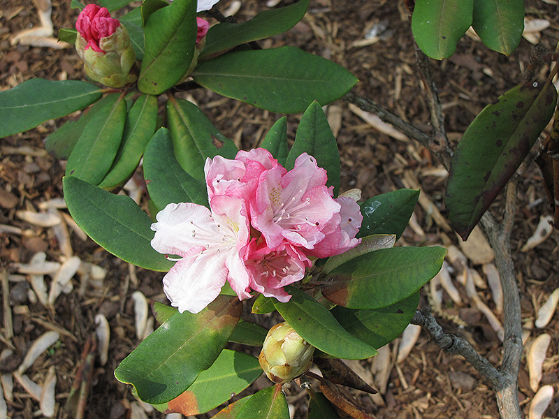 This shrub does best in full sun to partial shade. You may want to keep it away from hot, dry locations that receive direct afternoon sun or which get reflected sunlight, such as against the south side of a white wall. It requires an evenly moist well-drained soil for optimal growth, but will die in standing water. It is very fussy about its soil conditions and must have rich, acidic soils to ensure success, and is subject to chlorosis (yellowing) of the foliage in alkaline soils. It is somewhat tolerant of urban pollution, and will benefit from being planted in a relatively sheltered location. Consider applying a thick mulch around the root zone in winter to protect it in exposed locations or colder microclimates. This particular variety is an interspecific hybrid.
