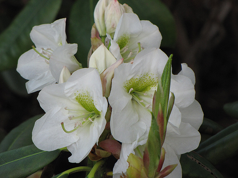 Madame Carvalho Rhododendron is bathed in stunning clusters of lightly-scented white trumpet-shaped flowers with a light green blotch at the ends of the branches in late spring. It has dark green evergreen foliage. The glossy narrow leaves remain dark green throughout the winter.