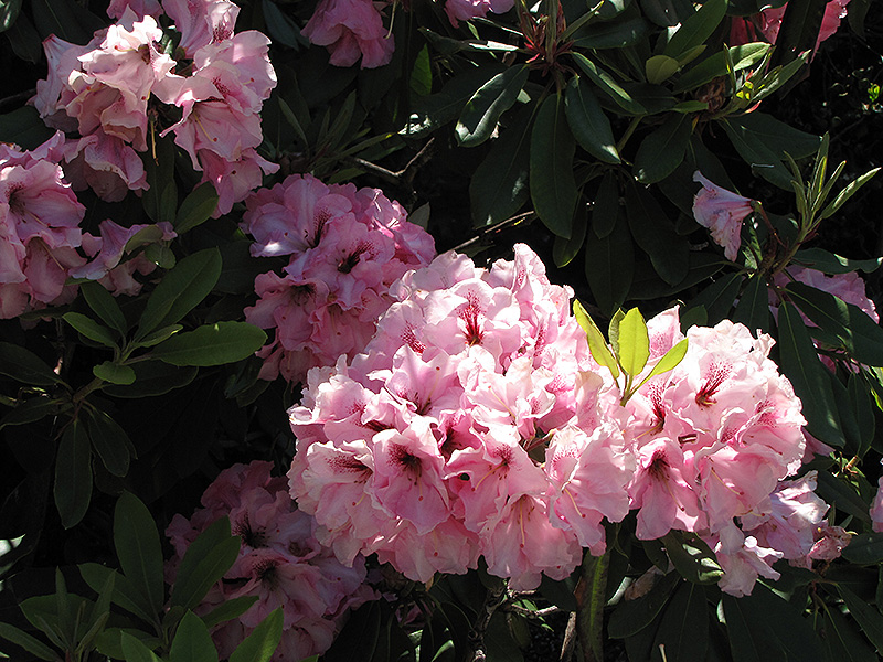 This rich looking evergreen shrub is bathed in clusters of shell pink blooms with a dramatic deep red blotch; an excellent choice to mass in groupings, or as an elegant focal point of the garden; must have rich acidic soil