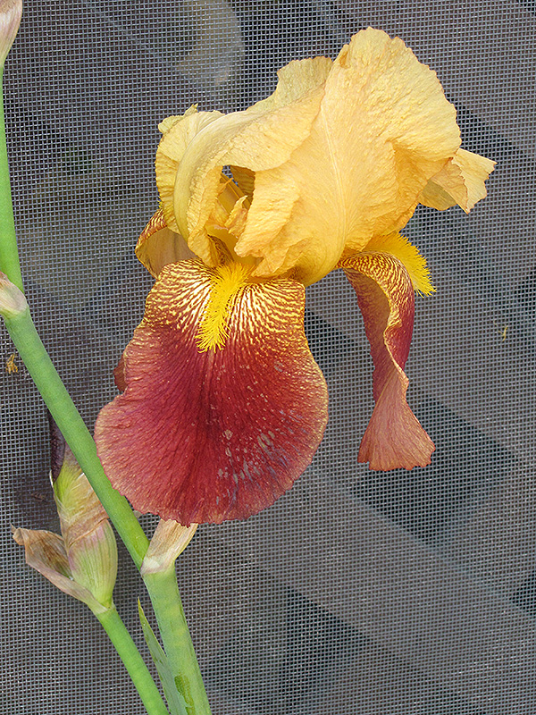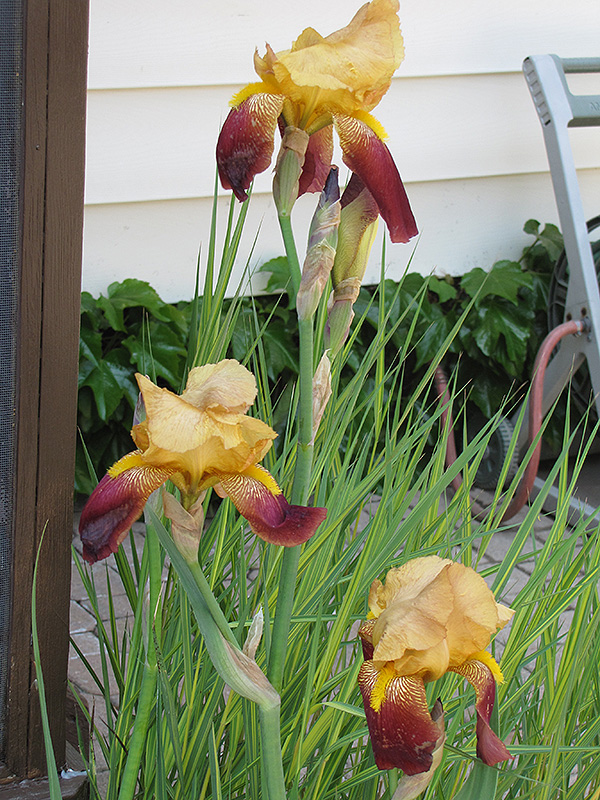 This tall, interesting iris with its complimentary tan and burgundy blooms and stunning yellow beard is a captivating addition to the perennial border; also excellent massed in groupings in the garden; will quickly form dense colonies