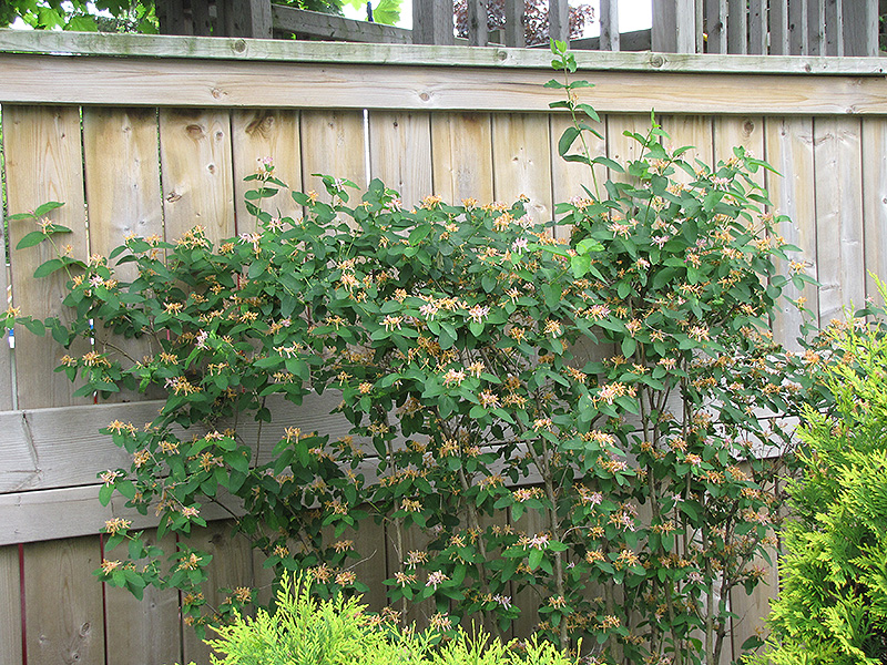 Belgica Honeysuckle will grow to be about 8 feet tall at maturity, with a spread of 5 feet. It tends to fill out right to the ground and therefore doesn't necessarily require facer plants in front, and is suitable for planting under power lines. It grows at a medium rate, and under ideal conditions can be expected to live for approximately 20 years.