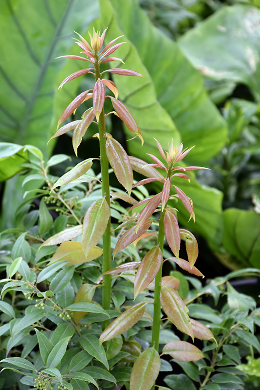 Pipestem features dainty nodding white bell-shaped flowers with shell pink overtones at the ends of the branches in late spring. It has dark green evergreen foliage. The glossy pointy leaves remain dark green throughout the winter.