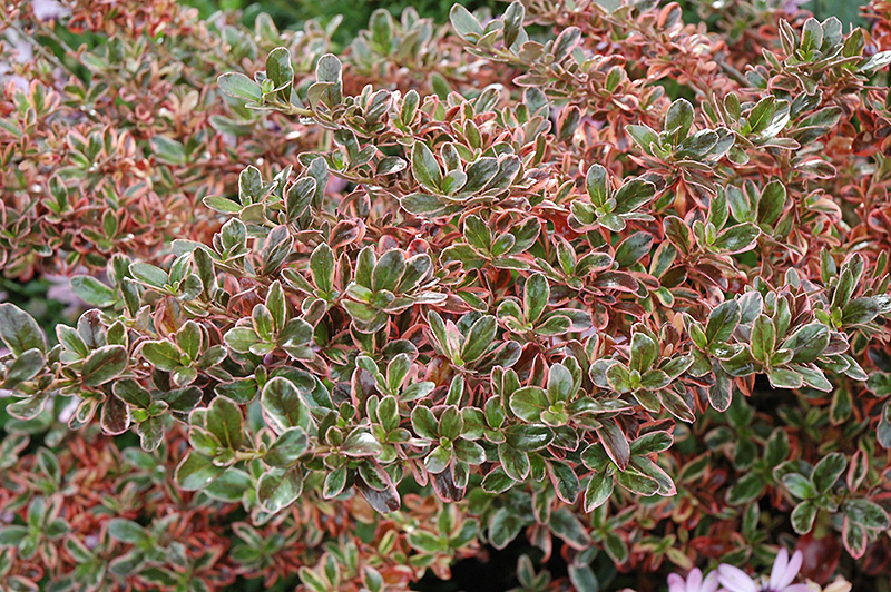 This variegated shrub features a rainbow of foliage colors; green and butter progress to hues of orange and red; perfect for shaping into topiaries or low hedges; great for shrub or mixed borders, containers, or framing garden features