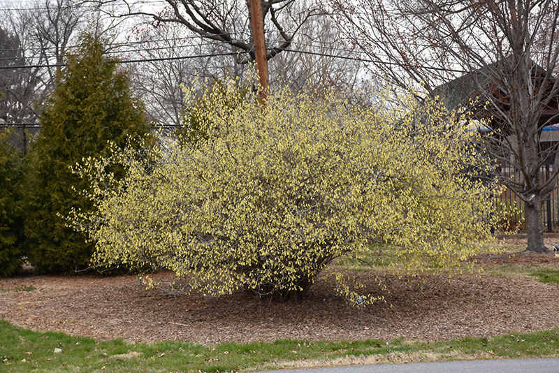 This radiant garden shrub is a harbinger of spring; dainty fragrant buttery-yellow flowers hang from bare branches in late winter, good habit of growth, and excellent fall color