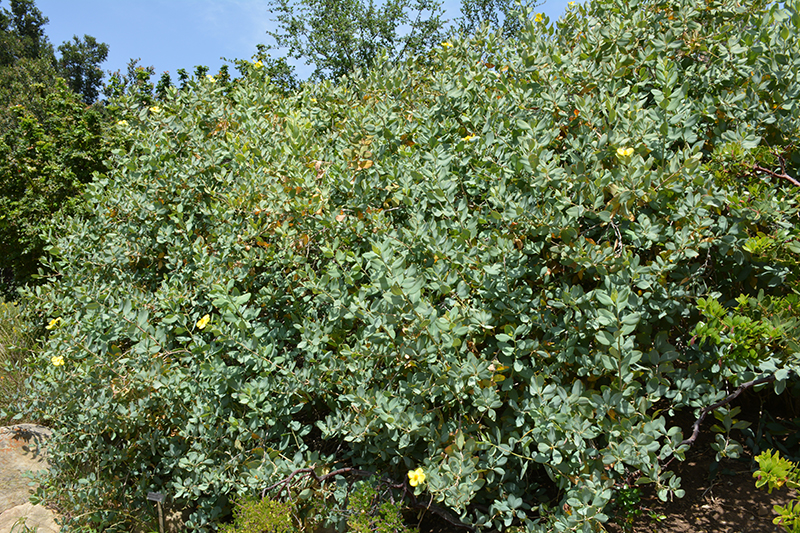 A wonderful evergreen shrub clothed with blue-green foliage, and is covered by large, bright yellow flowers from spring through summer; drought tolerant once established; a perfect accent shrub, or massed along borders