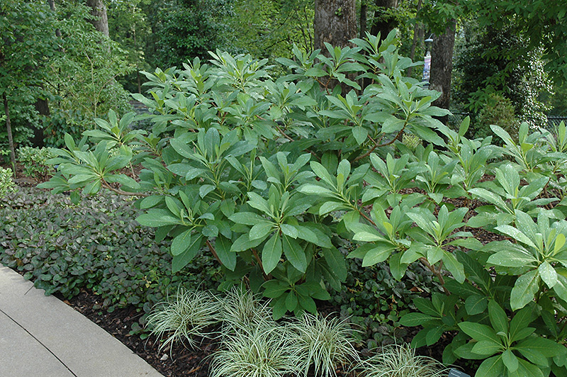 Oriental Paper Bush has masses of beautiful clusters of lightly-scented white trumpet-shaped flowers with yellow throats at the ends of the branches in late winter before the leaves, which are most effective when planted in groupings. It has attractive bluish-green deciduous foliage. The narrow leaves are highly ornamental but do not develop any appreciable fall colour. The brick red branches add an interesting dimension to the landscape.