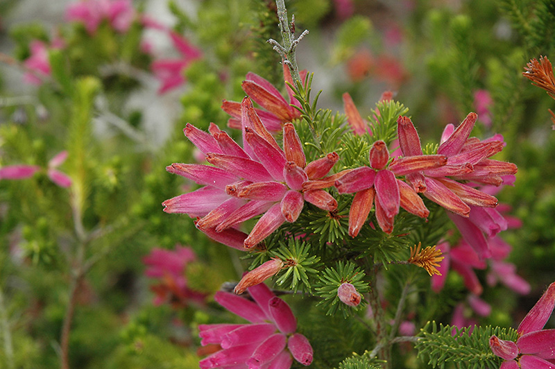 South African Heath is covered in stunning spikes of pink tubular flowers rising above the foliage from late winter to mid spring. It has light green evergreen foliage. The tiny needles remain light green throughout the winter.