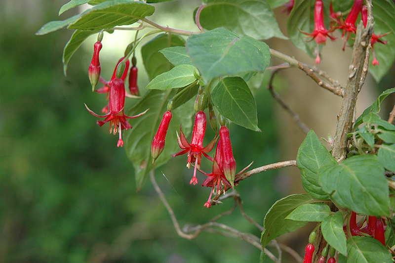 A sweet fuchsia variety featuring dainty red nodding flowers that contrast the mass of green foliage; very attractive to hummingbirds; a dense self supporting round shrub that has shown to be resistant to mites