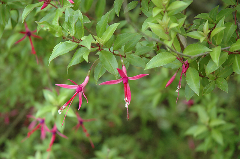 Glazioviana Fuchsia features dainty nodding hot pink trumpet-shaped flowers with royal blue throats along the branches from mid spring to mid fall. Its attractive small glossy pointy leaves remain green in colour with distinctive coppery-bronze edges throughout the year.