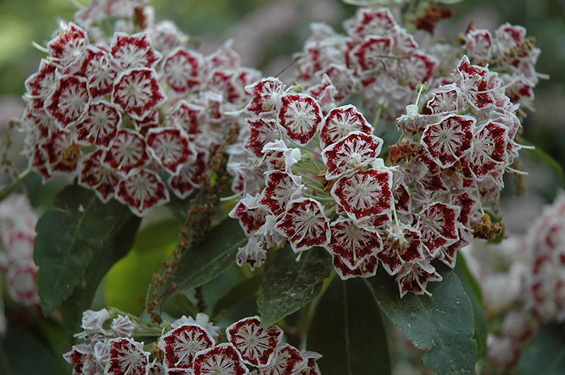 Bullseye Mountain Laurel features showy clusters of brick red cup-shaped flowers with white centers at the ends of the branches from mid to late spring, which emerge from distinctive purple flower buds. It has attractive dark green evergreen foliage which emerges burgundy in spring. The glossy pointy leaves are highly ornamental and remain dark green throughout the winter.