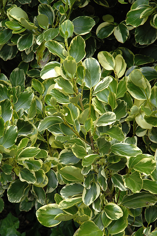 A vigorous dense evergreen with broad glossy variegated green and cream leaves; it is a shrub in habit and with regular shearing makes a great hedge; must have shelter from cold drying winds