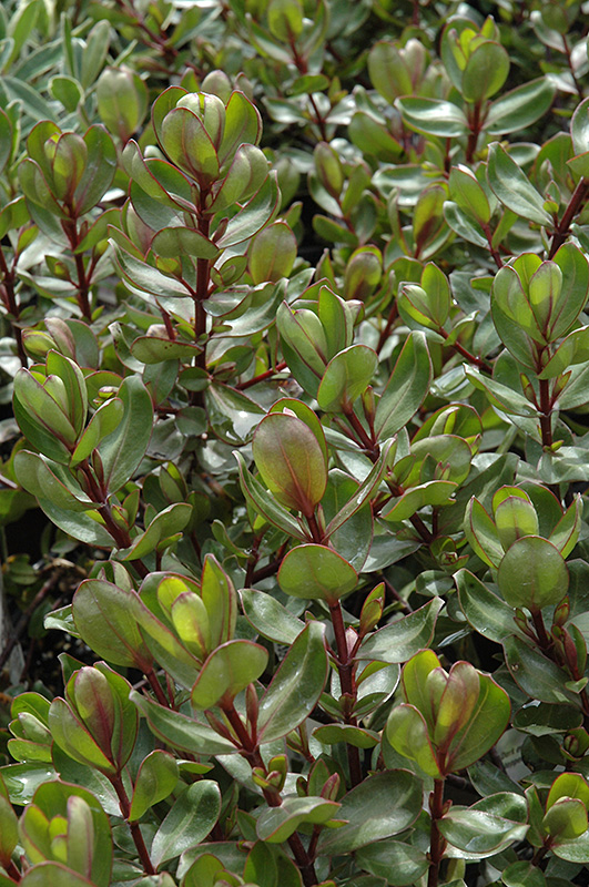 A lovely evergreen upright shrub with burgundy stems, and deep green glossy leaves; flowers are impressive when massed; will tolerate some mild frost, and should be sheltered