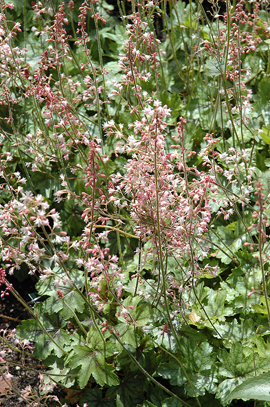 Dainty spikes of light-pink bells rise from a compact mound of silvery green foliage with burgundy veins; a cross between Heuchera and Tiarella; amazing contrast to other plants, great versatility; keep moist in heat of summer