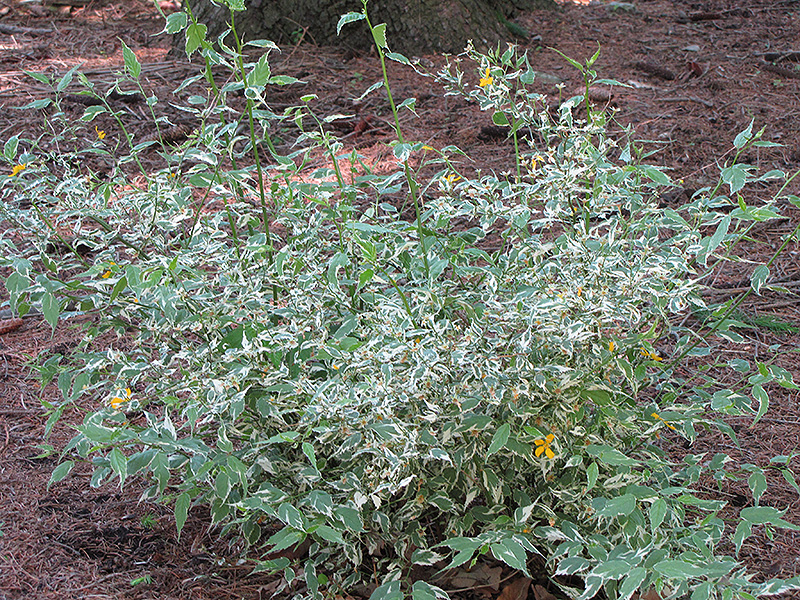 A colorful spring blooming shrub featuring bright yellow flowers on thin, colorful stems and variegated bright green leaves; spreads by suckering to form a natural mass; use in groupings in partial shade in the garden for color contrast