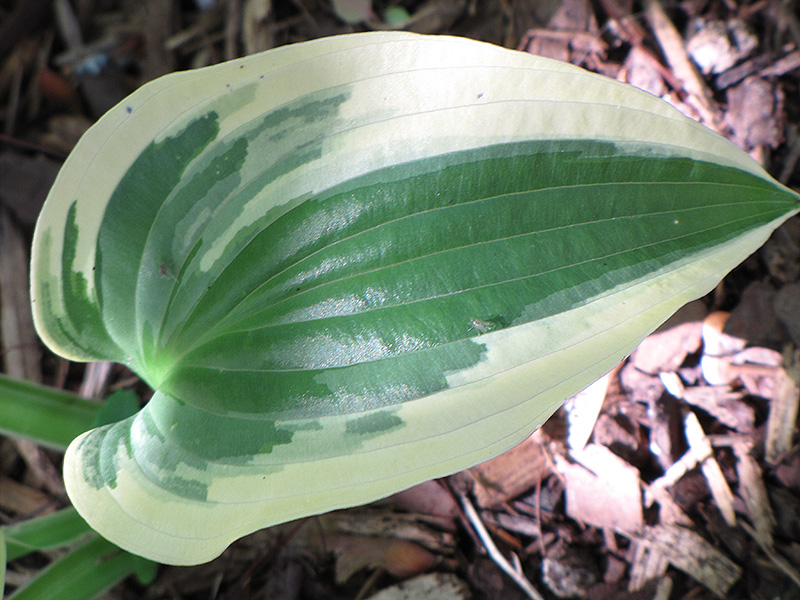 A favorite variety with spear shaped green leaves that are heavily corrugated, with a wide cream margin; ; provides beautiful texture and contrast to other plants; lavender spikes of flowers in mid-summer
