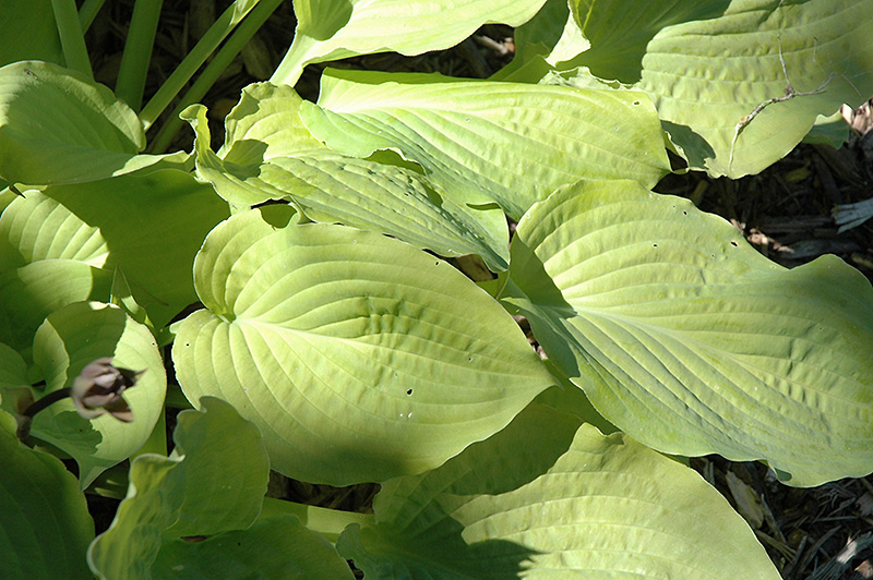 A spreading variety with large, wavy, chartreuse-gold leaves that fan out to make an impressive clump; very sun tolerant when kept moist; provides beautiful texture and contrast to other plants; tall spikes of light purple flowers in early summer
