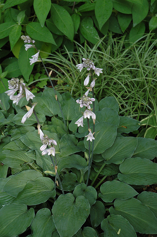 A large variety with heart shaped, blue-green foliage that turns green mid-season; lightly wavy margin becomes more so with maturity; provides beautiful texture and contrast to other plants; lavender spikes of flowers in mid-summer